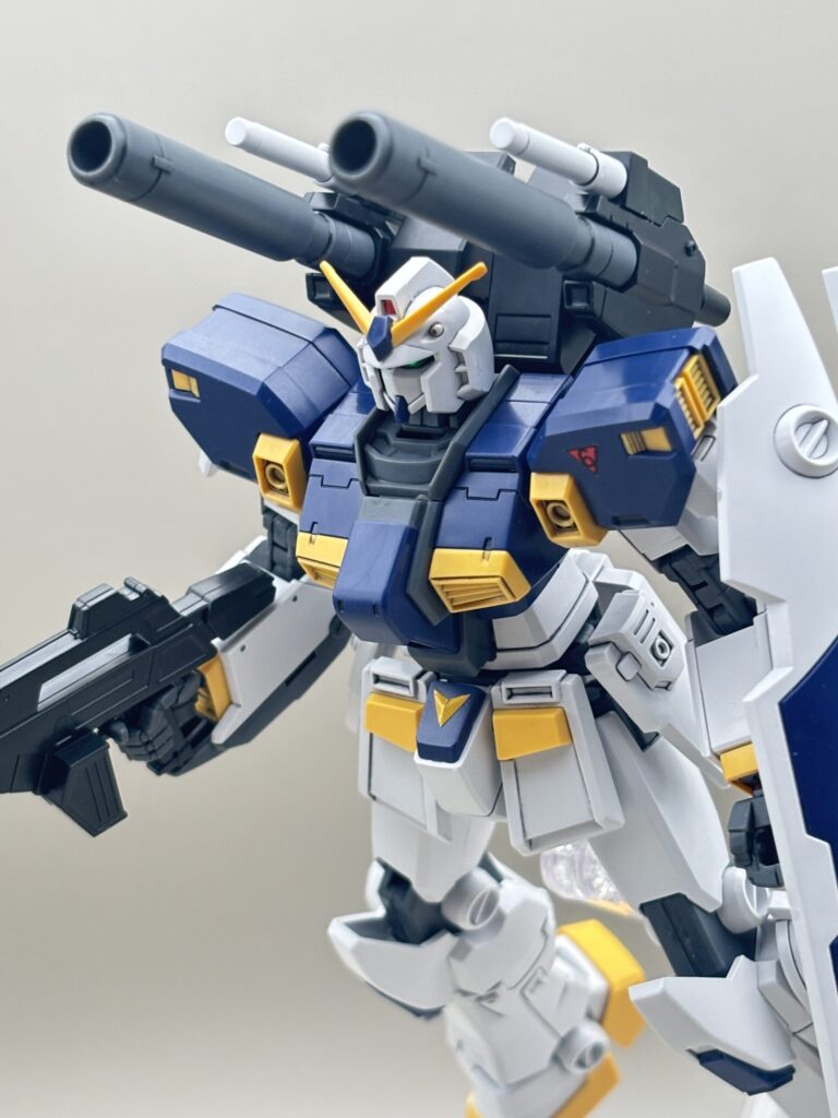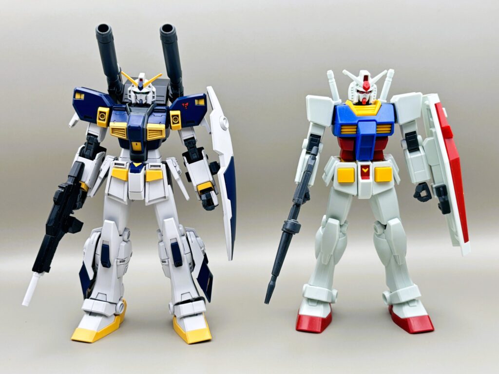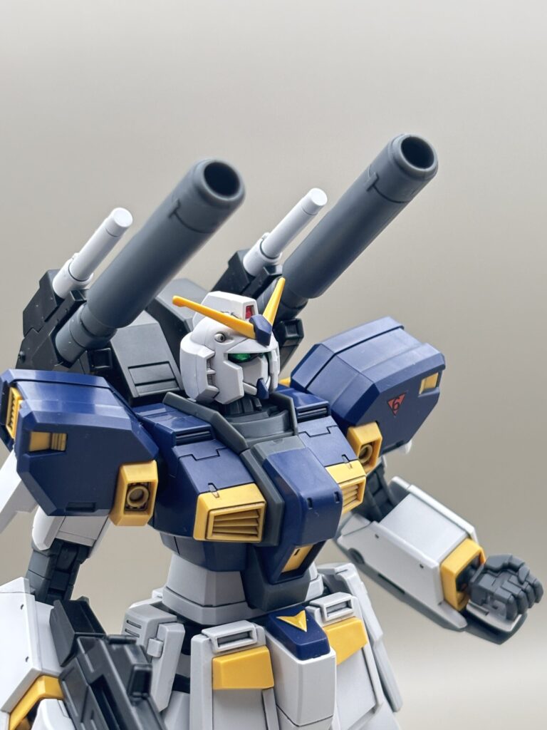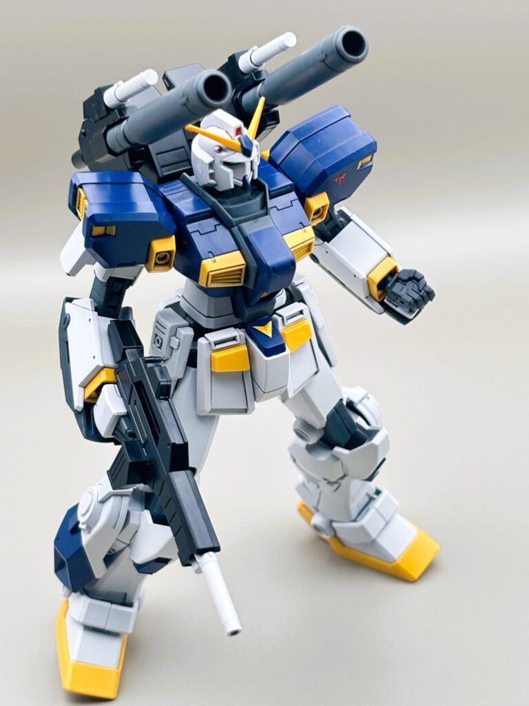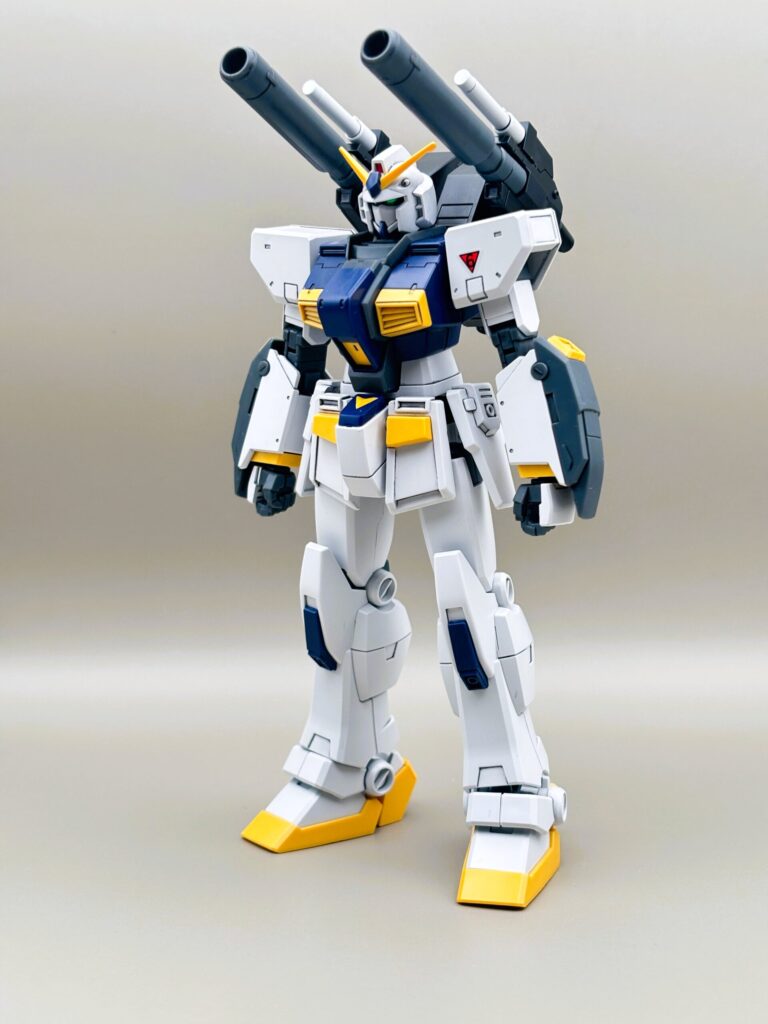 RX-78ガンダムをベースにしつつも、キャノン砲や脚部の増加装甲によって、非常に「強そう」なシルエットになっています。
