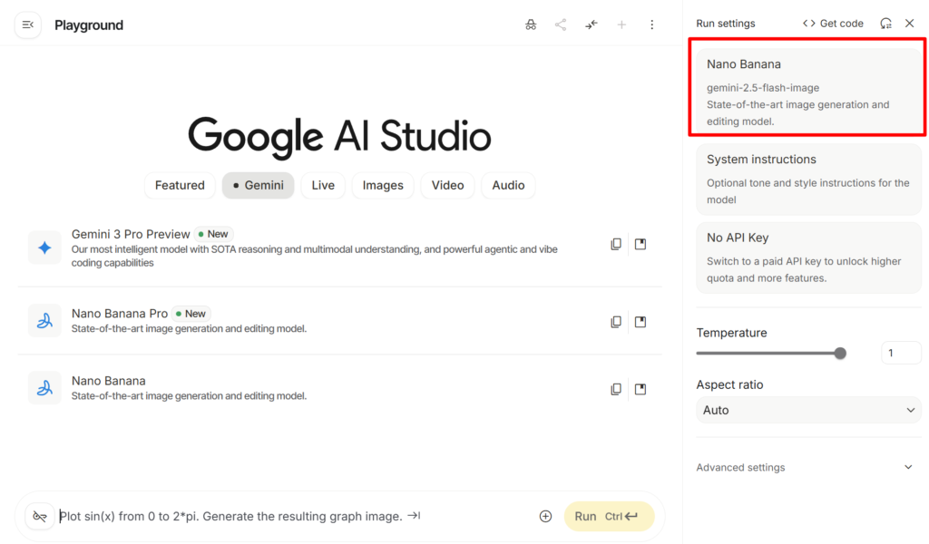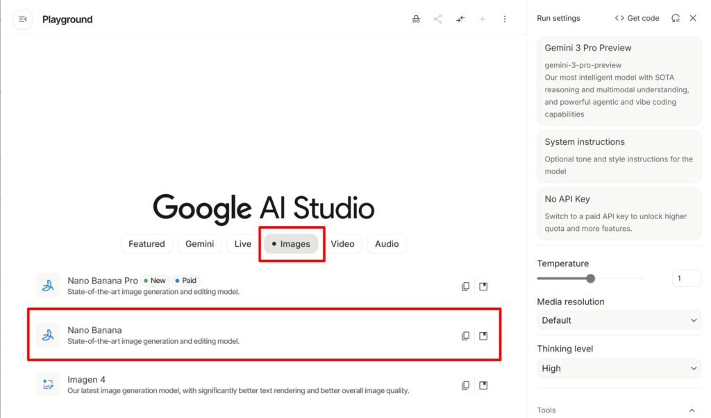 ③Playground画面から「Images」をクリックして、「Nano Banana」をクリック。