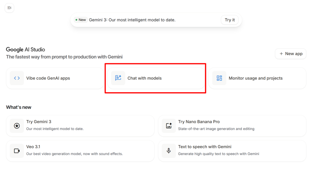 ②Home画面が表示された場合は、「Chat with models」をクリック。